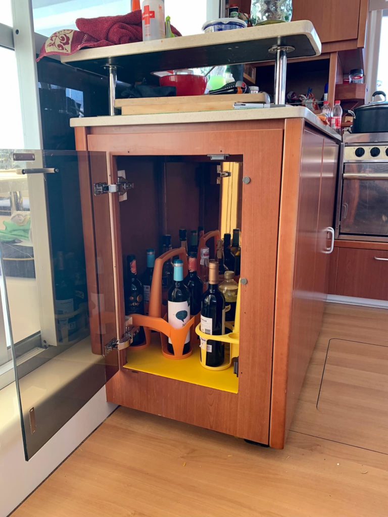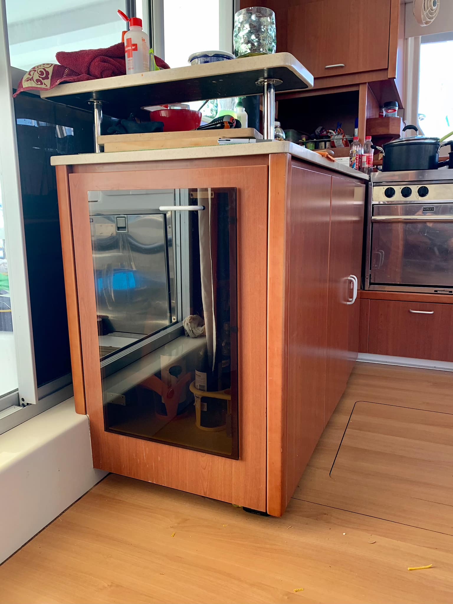 И получилось, что за эти деньги я могу купить минимум 900 пачек льда в любом супермаркете или в автоматах на половине яхтенных заправок! Довольно долго льдогенератор просто занимал место. Пока наконец не грянул ковид и мы не зависли в марине Сан Мигель. В результате, от нечего делать, я выломал ненужный ящик и вместо него сделал классный бар! С включающейся при открытии подстветкой, с зеркалами, с автодоводчиком. Хотел еще музыку, как в «Иван Васильевич..» приделать, но решил, что это перебор.