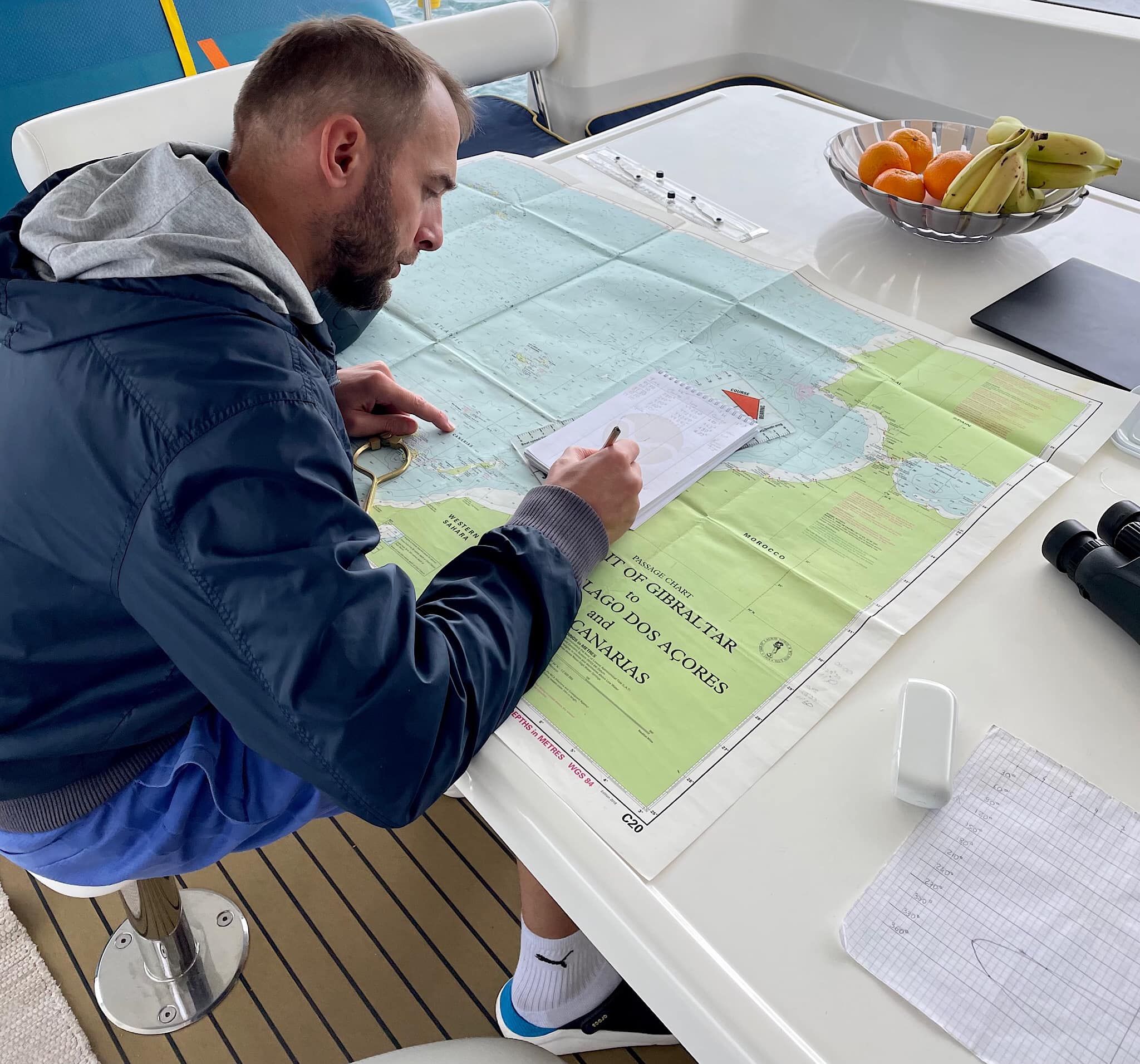 В кокпите карты разложены, на камбузе на электроплитке суп варится, а на газовой плите зажарка для супа готовится. Подошел, помешал и дальше объяснять премудрости картографии. Стоим на якоре в спокойном месте, девочки уехали на берег прогуляться.