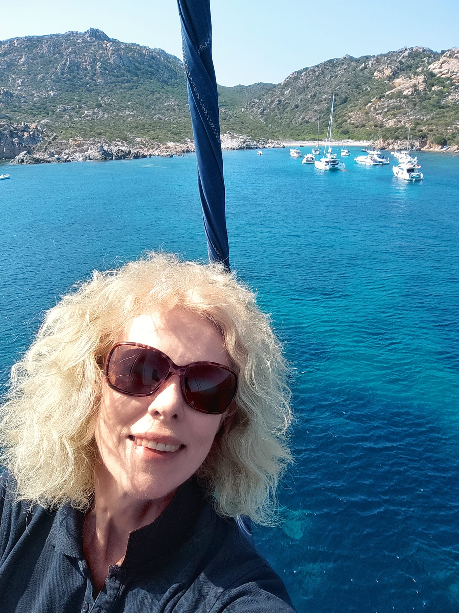 Однако, сегодня и ветер! Мы же, по сути, в проливе между Сардинией и Корсикой. Эффект аэродинамической трубы, дует почти всегда. Так что качественное селфи сделать не удалось. На мачту меня поднимают лет шесть, всегда по делу. Всё дело в том, что у меня совершенно нет страха высоты. Полный наборт разных страхов, а вот с высотой я на «ты». Поэтому, наверное, меня так тянет в горы, а в пещерах и ущельях чувствую себя крайне некомфортно.