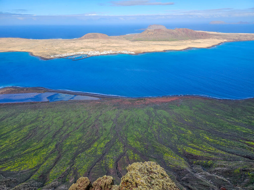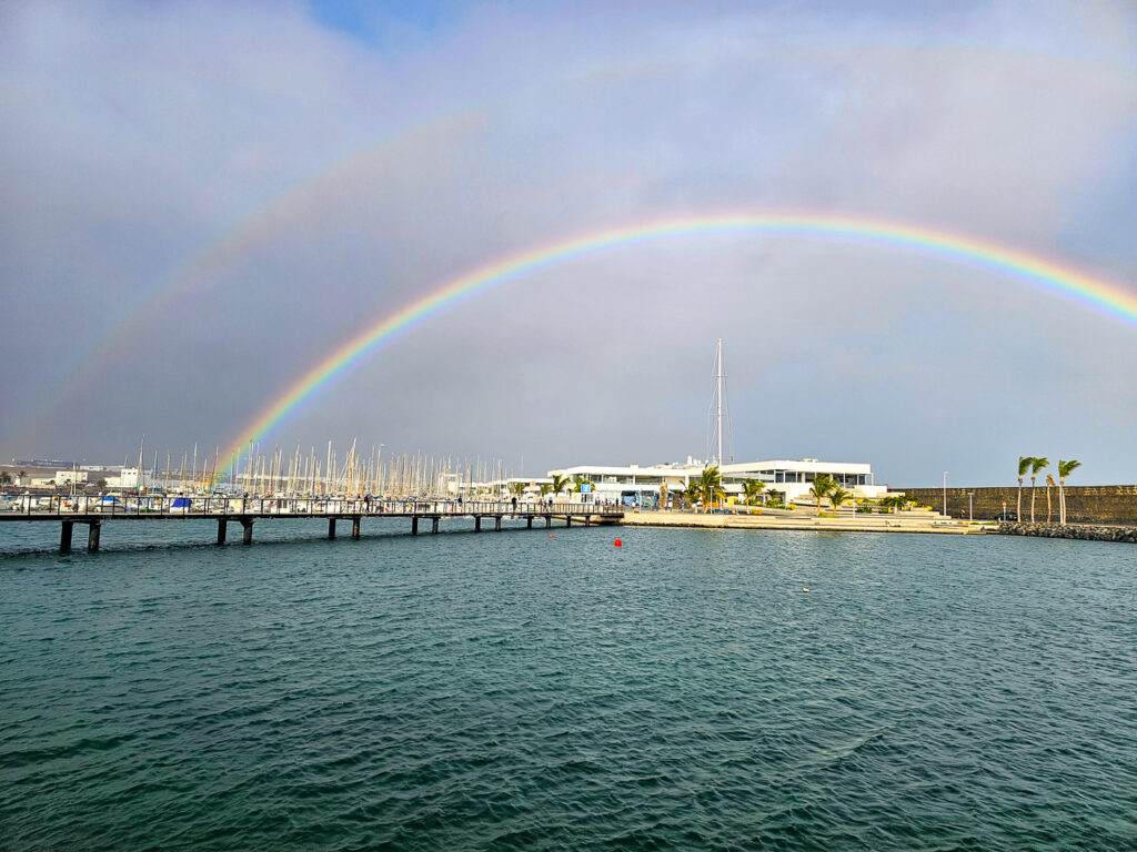 На календаре конец января, нетипично влажная для Лансароте зима продолжается. Фронт за фронтом, я имею в виду конечно же циклоны — это единственное, что нас тревожит. Фронты приносят шквалы из-под туч и поднимают волну со всех сторон. Зато вообще нет калимы. Дождики понемногу моют палубу, ветреные дни сменяются штилем, как сегодня. Склоны обычно безжизненных вулканов покрылись зелёным пухом, усыпанным жёлтыми, белыми и фиолетовыми цветами. Даже Тиманфайя местами поросла травкой. Временами ловлю себя на мысли, что я на Азорах: зелёные поля в обрамлении чёрных камней и синего океана.