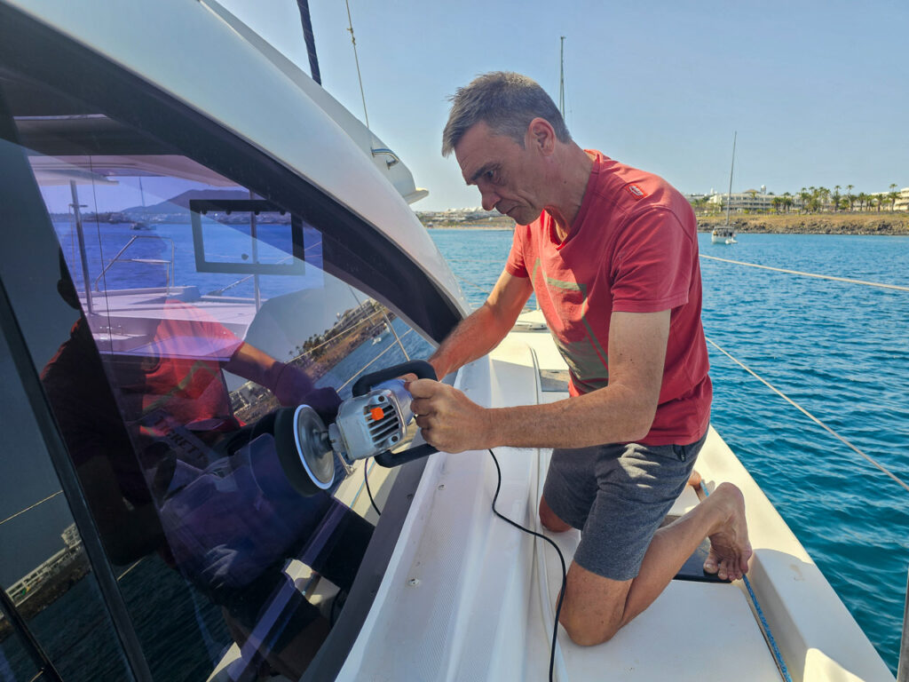 Апрель такой приятный месяц. Длинная зимовка почти позади, впереди летние путешествия. В марте Марат занимался восстановлением и защитой гелькоата, а в апреле принялся за окна. Моет, полирует, покрывает защитным составом. Боковые окна в салоне у нас закрыты сверху сеткой – салон меньше нагревается от солнца и не так видно, что внутри. Но даже под сетками поверхность поликарбоната исцарапалась. А главное, умер герметик вокруг окон. Пришлось его вычищать, сто раз промывать и обезжиривать, а затем накладывать новый слой сикафлекса. Марат терпеть не может работать с сикафлексом, расстраивается, что швы у него получаются не такие, как на верфи. Но ведь там швы делают специальным инструментом под давлением. На мой взгляд, у Марата получилось хорошо, а главное – функционально заменить герметик. Заодно и сетки подшили в мастерской, так как нитки под воздействием солнца и соли имеют свойство умирать.